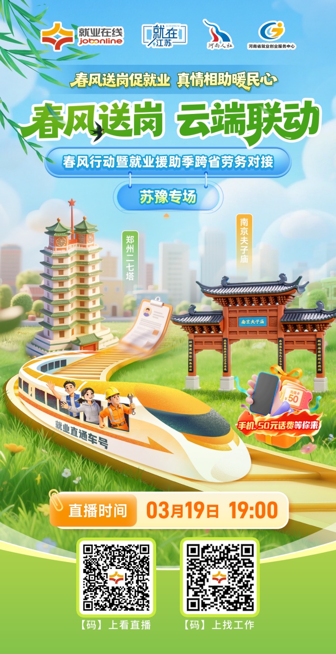 “春风送岗促就业 真情相助暖民心”,2026年春风行动火热进行中,“就业在线”平台开展春风行动暨就业援助季跨省劳务对接系列直播带岗活动。3月19日19:00,“就业在线”平台携手江苏省、河南省人社厅开展春风行动暨就业援助季跨省劳务对接苏豫专场直播,为您带来权威政策解读,优质岗位推介正规配资炒股平台,专业求职指导,助力广大求职者就业。